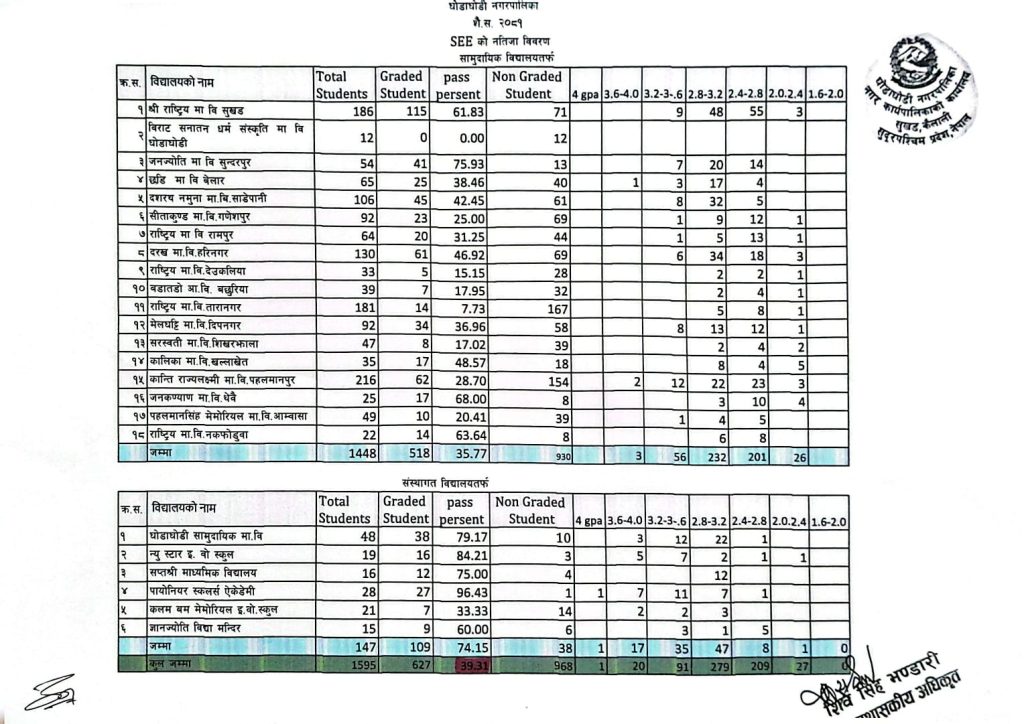 सामुदायिक विद्यालयतर्फ ३५ .७७ र संस्थागत विद्यालयतर्फ ७४.१५ विद्यार्थी उत्तीर्ण भएका छन् । सामुदायिक विद्यालयहरूबाट सहभागी भएका १४४८ विद्यार्थीमध्ये ५१८ विद्यार्थी अर्थात् ३५.७७ प्रतिशत उत्तीर्ण भएका हुन् । भने संस्थागत विद्यालयबाट सहभागी १४७ विद्यार्थीमध्ये १०९ अर्थात् ७४.१५५ विद्यार्थी उत्तीर्ण भएका छन् ।