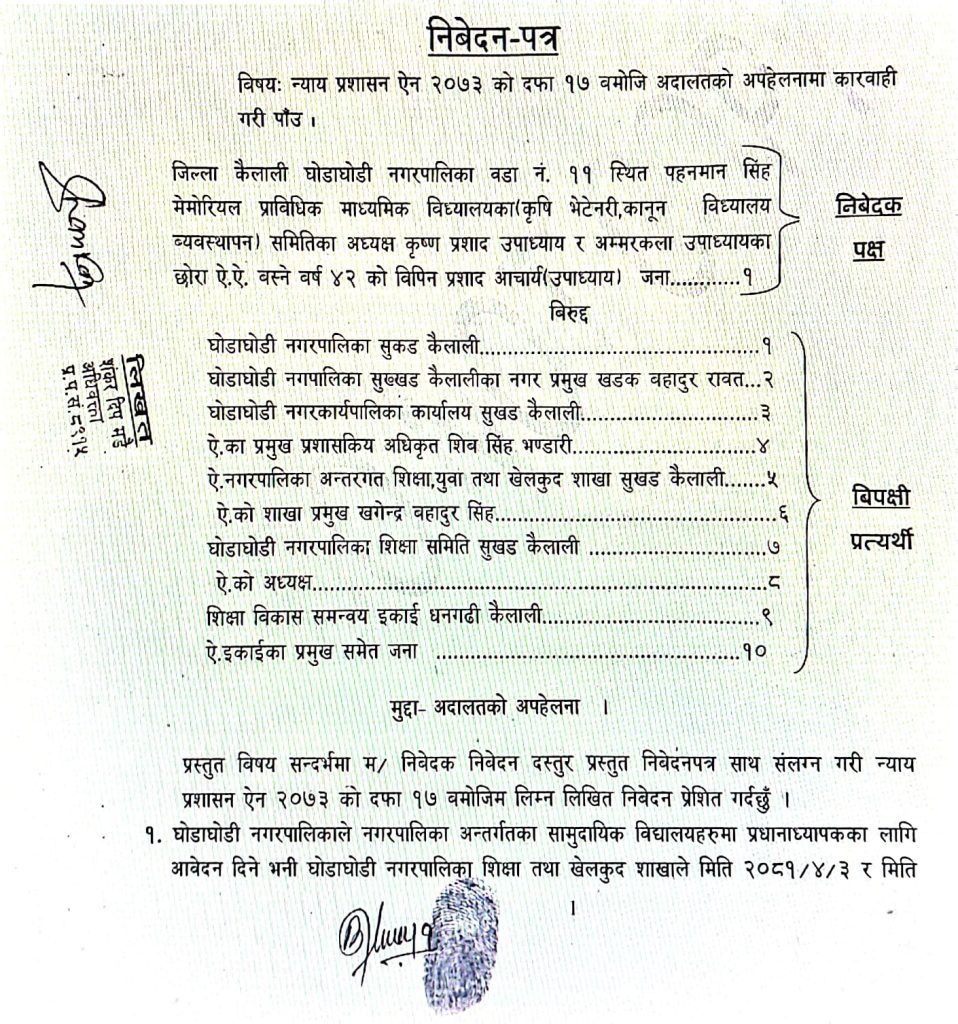 कैलालीको घोडाघोडी नगरपालिकाको नाममा उच्च अदालत दिपायलमा अपहेलना (अदालतको अवज्ञा) मुद्दा दर्ता गरिएको छ।