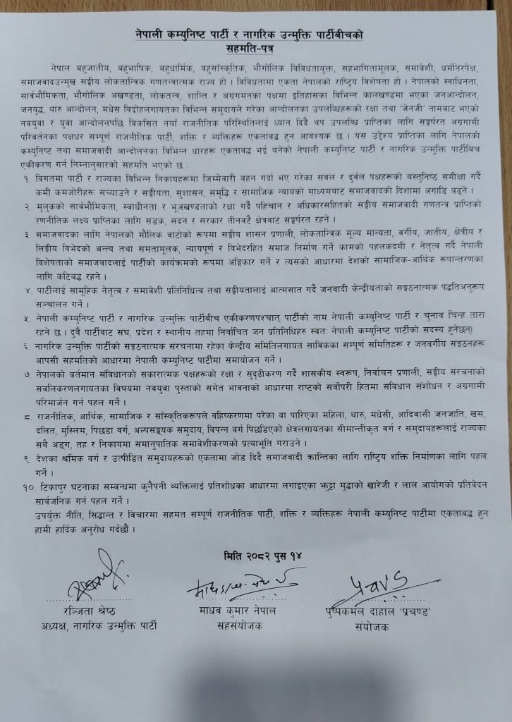 पार्टी एकताको सहमतिपत्रमा नाउपाका तर्फबाट अध्यक्ष रञ्जिता श्रेष्ठ, नेकपाका तर्फबाट संयोजक पुष्पकमल दाहाल र सहसंयोजक माधव कुमार नेपालले हस्ताक्षर गरेका छन्।