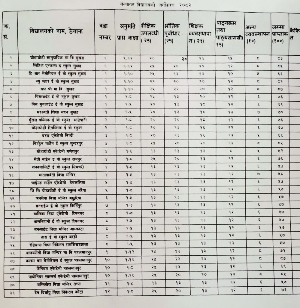 नगरपालिकाका अनुसार यी पाँचै शीर्षकमा २५–२५ अङ्क निर्धारण गरी कुल १०० अङ्कको मापदण्ड तयार गरिएको थियो। सोही आधारमा गरिएको मूल्याङ्कनमा ७ विद्यालय ‘ख’ वर्गमा पर्न सफल भएका छन्। जसमध्ये ६ वटा विद्यालय माध्यमिक तह (कक्षा १० सम्म) सञ्चालनमा रहेका छन् भने १ विद्यालय आधारभूत तह (कक्षा ८ सम्म) सञ्चालनमा रहेको छ।