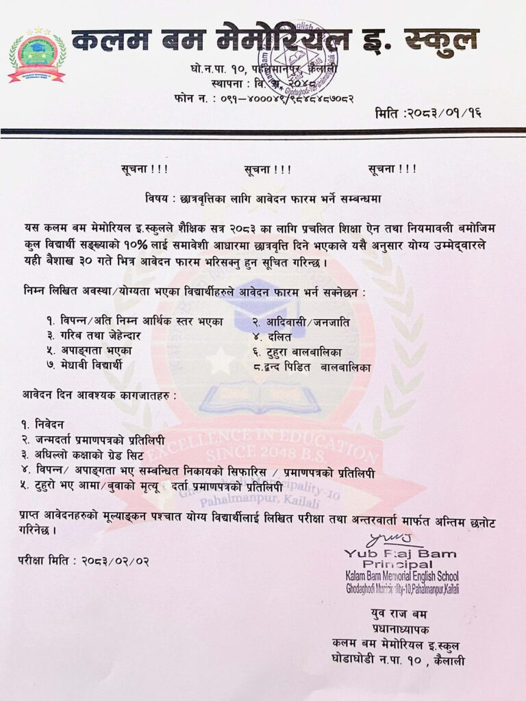कैलालीको घोडाघोडी नगरपालिका–१० पहलमानपुरमा रहेको कलम बम मेमोरियल इङ्लिस बोर्डिङ स्कुलले शैक्षिक सत्र २०८३ का लागि समावेशी आधारमा छात्रवृत्ति आवेदन खुला गरेको छ।