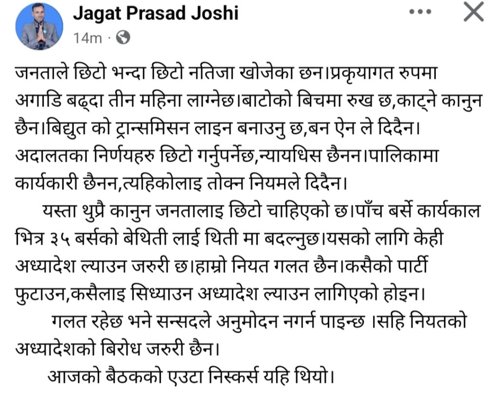 कैलाली निर्वाचन क्षेत्र नम्बर ३ का प्रतिनिधिसभा सदस्य जगत प्रसाद जोशीले विकास निर्माण, प्रशासनिक काम र सार्वजनिक सेवा प्रवाहमा देखिएका कानुनी जटिलताका कारण सरकारले अध्यादेश ल्याउनुपर्ने अवस्था आएको बताएका छन्।